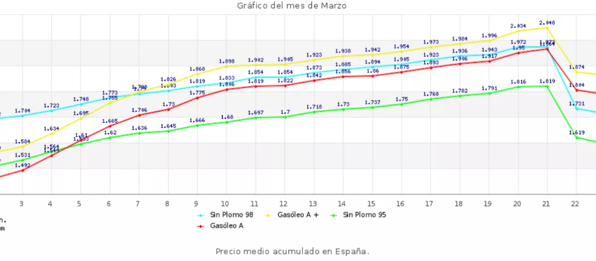 El domingo, la gasolina y el diésel, ya con las ayudas, se despertaron respectivamente a 1,61 euros y a 1,80 euros, lo que significa que la bajada de precios real fue de 20 céntimos en el caso de la gasolina y de 16 céntimos en el caso del gasóleo, tomando siempre valores medios.