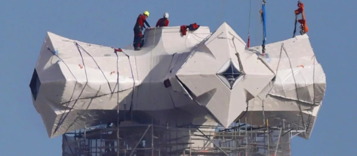 Colocación del cuarto brazo horizontal de la torre de Jesucristo de la Sagrada Familia
