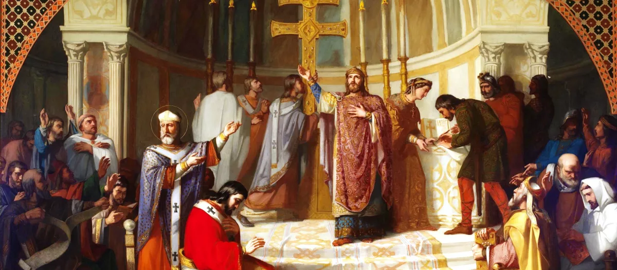El lienzo representa el III Concilio de Toledo, celebrado en la ciudad de Toledo en el año 589, durante el reinado de Recaredo, quien abandonó el arrianismo y se convirtió al catolicismo