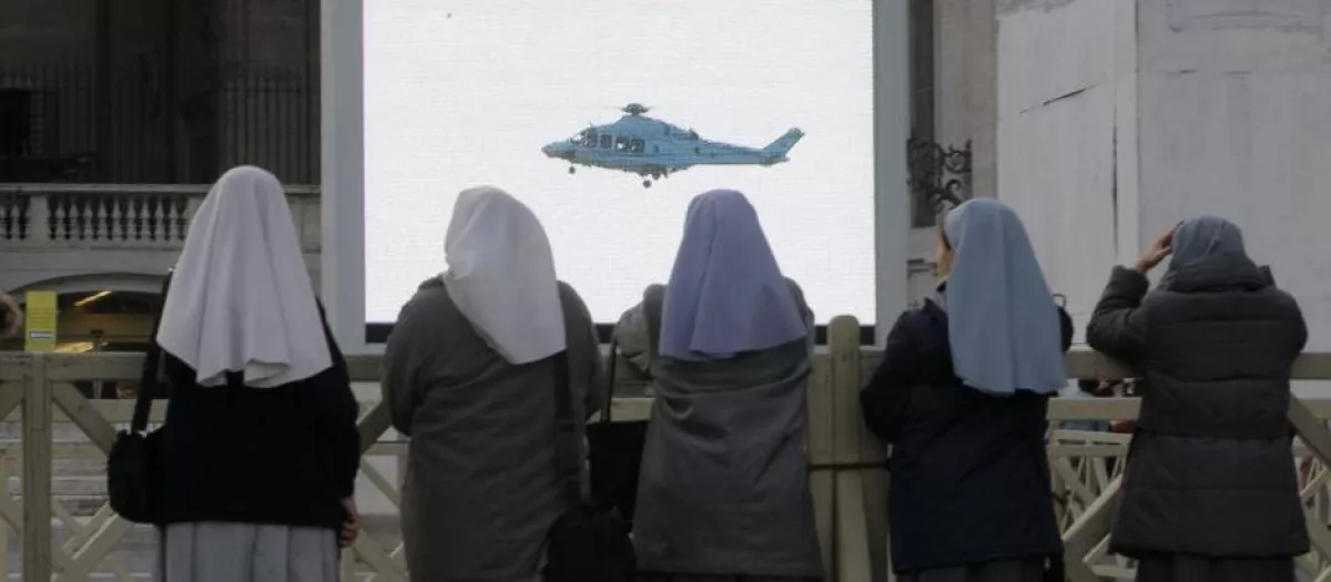 Varias religiosas observan el helicóptero de Benedicto XVI el día de su renuncia