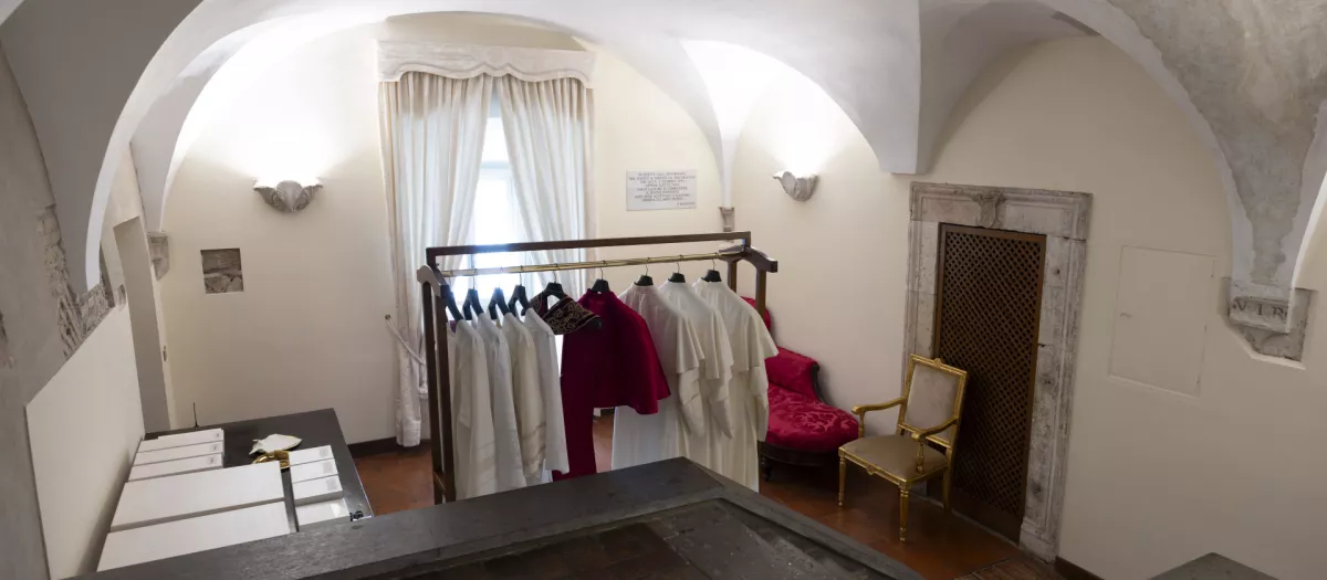 La habitación se encuentra a tan solo unos metros de la Capilla Sixtina. Tiene una apariencia modesta y en ella el Papa electo encuentra una percha, un diván rojo, una cruz, algunas imágenes marianas y fragmentos de antiguos frescos. Es un vestidor que sirve para mucho más que simplemente cambiarse para presentarse al mundo con los atuendos papales. Es un umbral de transición, un lugar en el que coger fuerza antes del primer acto público como líder de la Iglesia.