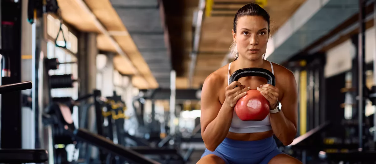 Una mujer hace sentadillas mientras entrena con pesas en un gimnasio