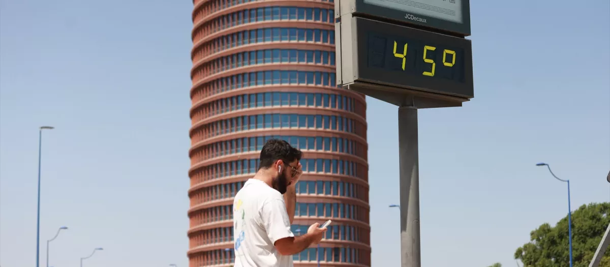 (Foto de ARCHIVO) Un termómetro junto a la Torre Pelli marca 45 grados, a 24 de agosto de 2024 en Sevilla