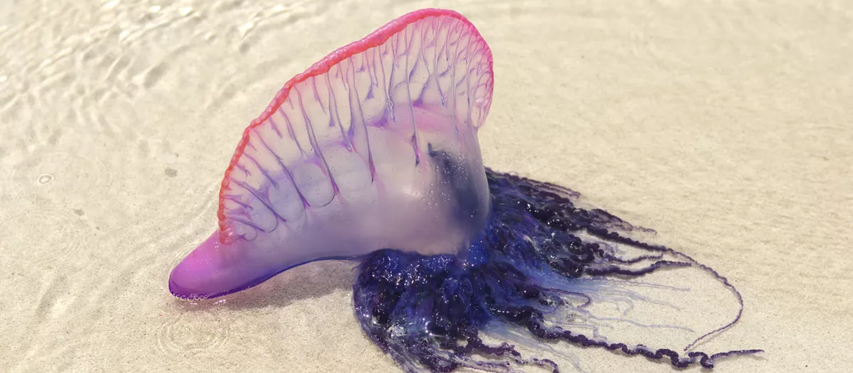 Aunque es habitual confundirla con una medusa, la carabela portuguesa es un organismo denominado hidrozoo colonial, formado por centenares de individuos especializados que trabajan juntos como si fueran un solo ser vivo.