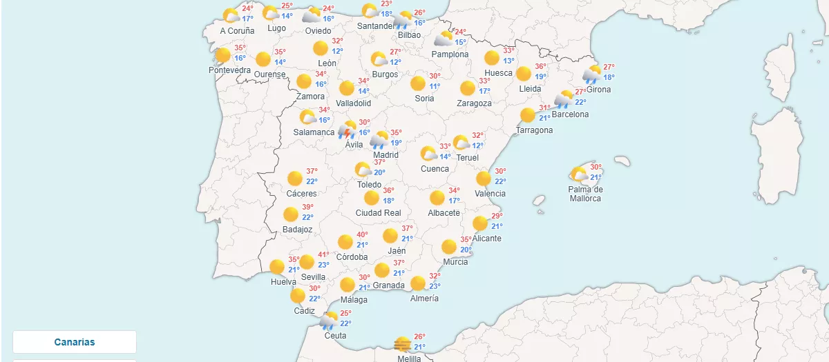 Están en alerta por las altas temperaturas las comunidades de Andalucía, Castilla y León, Castilla-La Mancha, Extremadura, Galicia y Madrid, y en dos de ellas (Andalucía y Extremadura) el nivel de aviso es además naranja (riesgo importante) porque los termómetros se van a disparar por encima de los 40 grados.
