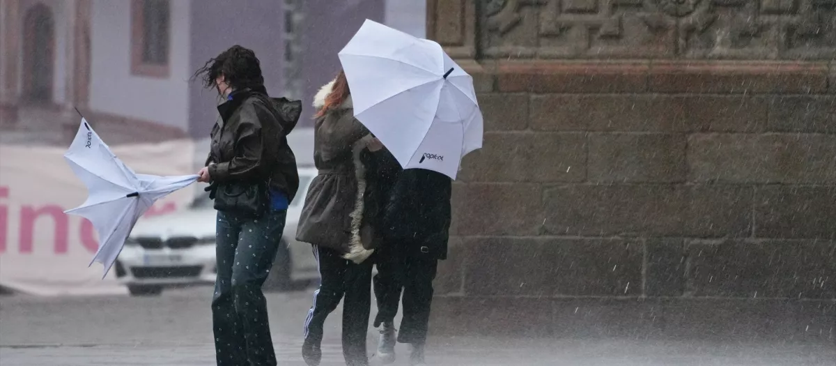 Varias personas intentan sujetar sus paraguas en Santiago de Compostela, La CoruñaEuropa Press