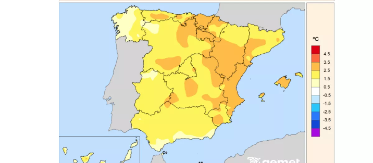 Febrero fue, según sus datos, muy cálido en la España peninsular. La temperatura media se situó en 9,5 °C, lo que supone 2,4 °C por encima de la media del periodo 1991-2020. Con estos datos, se convierte en el cuarto febrero más cálido desde que comenzó la serie en 1961 y el segundo del siglo XXI, solo por detrás de 2020 y 2024.