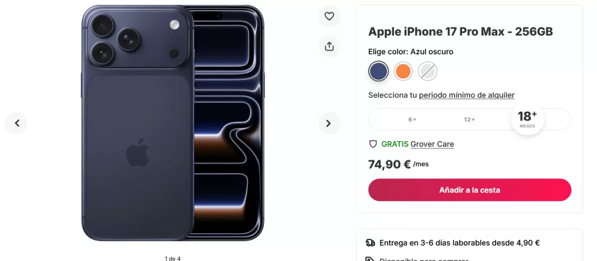 Frente a la compra con financiación, Grover presenta una alternativa completamente diferente como es el alquiler de tecnología sin compromiso de adquisición. Esta plataforma alemana, que opera en España desde 2021, permite alquilar el iPhone 17 Pro Max por 74,90 euros al mes durante 18 meses. Al cabo de ese periodo, el usuario habría pagado 1.348,20 euros por el uso temporal del dispositivo, sin llegar a ser propietario del mismo.